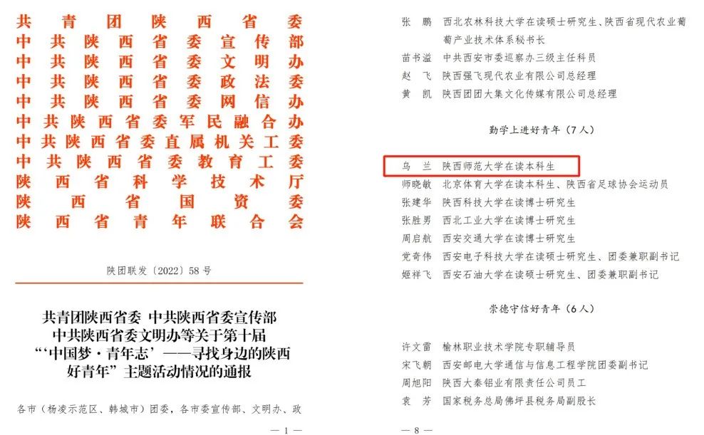 近日,由团省委、省委宣传部、省委文明办、省委政法委、省委网信办、省委军民融合办、省委直属机关工委、省委教育工委、省科技厅、省国资委、省青联等单位共同举办的第十届“‘中国梦·青年志’——寻找身边的陕西好青年”主题活动结果揭晓。3044am永利集团3044noc2019级本科生乌兰被推选为陕西好青年——勤学上进好青年。